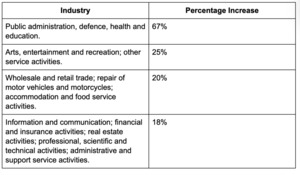 The second-highest increase in fatalities is by 25% by those that work in the arts, entertainment and recreation industry, while the third-highest is an increase of 20% in the wholesale and retail trade industry.