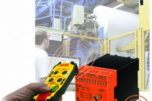 The standard Safemaster “W” wireless safety system from Dold Industries consists of a light weight compact transmitter unit which incorporates a PLe, SIL3 E-stop pushbutton and up to eight programmable semiconductor outputs and 3 redundant safety relay outputs on the receiver.