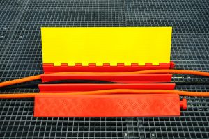Heavy duty cable guards protect electrical cables and hoses in an outdoor setting reducing tripping points for traffic and reducing electrical shock risks when cables and hoses are exposed to the outdoor elements.