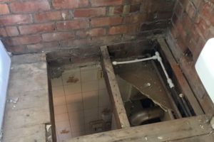 A GRANDFATHER died after falling through a hole in his own bathroom that had been left by workers.